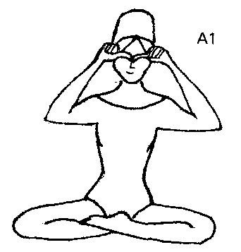 Сядьте в Простую позу, позвоночник прямой. Сожмите руки в кулаки. Поднесите кулаки к лицу на расстояние 15-20 см ото лба. Тыльные стороны ладоней обращены к лицу. Вытяните большие пальцы и надавите кончиками пальцев друг на друга, пока они слегка не побелеют. Не нужно надавливать очень сильно, просто прикладывайте определённое усилие.