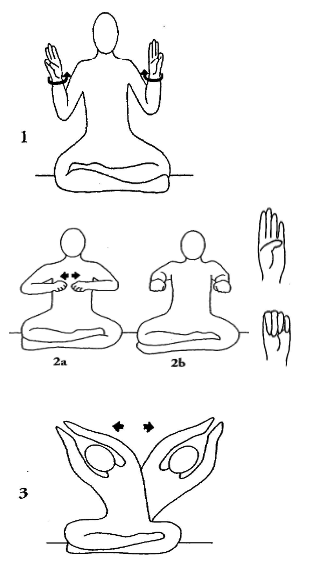 1. Сядьте в Простую Позу, руки по бокам, согнуты в локтях, предплечья направлены вверх. Большой палец соединён с пальцем Меркурия, остальные пальцы вместе, прямые, направлены вверх. Ладони смотрят наружу. С силой поверните запястья внутрь, так чтобы ладони были обращены к плечам, затем поверните обратно, в исходное положение. Продолжайте быстрые повороты запястий внутрь и обратно, одновременно энергично качая пупком с мощным Дыханием Огня. Выполняйте 3 минуты.