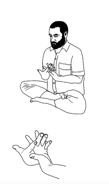 Мудра: Выполните Сераб Кала мудру. Сераб Кала мудра очень проста. Разверните ладони вверх и переплетите пальцы противоположных рук так, чтобы они смотрели вверх под углом 45°. Большие пальцы направлены прямо от тела и параллельны полу. Кисти рук образуют лотос, и пальцы направлены вверх и в стороны подобно мечам Шивы. Руки образуют открытый лотос у сердца. Он очень красив, если сделать его правильно. Очень красивый открытый лотос. Он полностью закрыт снизу.