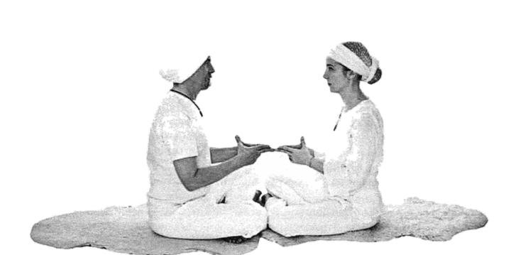 Мудра: Данная мудра полярна Тратаке Дхьян из предыдущей медитации. Соедините все кончики пальцев противоположных рук вместе, пальцы надавливают друг на друга, ладони отведены в сторону в форме «шалаша». Загните мизинцы и безымянные пальцы внутрь и вниз между ладонями, чтобы задние стороны первых и вторых фаланг пальцев оказались соединёнными. Направьте мудру на партнёра; поддерживайте запястья выпрямленными. Предплечья находятся на уровне солнечного сплетения. Соприкоснитесь с партнёром кончиками средних пальцев рук. Прикосновение лёгкое, но ощутимое. Большие пальцы смотрят вверх, подушечки соединены.
