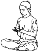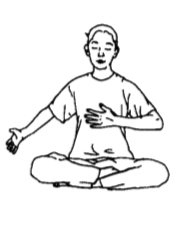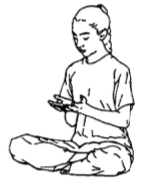3. Сидя с прямой спиной в любом удобном положении, соедините кончики пальцев на уровне диафрагмы, сами пальцы свободно расставлены и расслаблены. Большие пальцы выпрямлены и не касаются друг друга. Смотрите вниз под углом 60°.