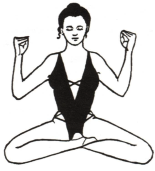 Поза и Мудра: В Простой позе с прямой спиной согните руки в локтях и поднимите кисти рук на уровень горла, расположив их по сторонам. Надавите кончиками больших пальцев на кончики остальных пальцев. Направьте кончики пальцев в сторону головы.