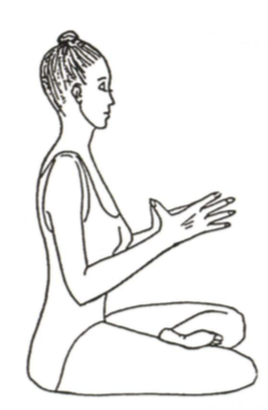 Положение рук: Поднимите руки на уровень Сердечного центра и сложите кистй рук «шалашиком»: прикоснитесь кончиками пальцев одной руки к кончикам соответствующих пальцев другой руки. Слегка надавливайте кончиками пальцев друг на друга.
