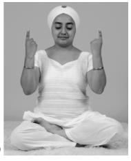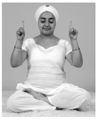 Мудра: Сядьте в Простую Позу с прямой спиной. Со- гните руки в локтях, локти опущены вниз по бокам от туловища. Поместите кисти рук напротив плеч, развернув ладони вперёд. Сложите пальцы в свободные кулаки, так чтобы большие пальцы располагались поверх остальных, и выпрямите пальцы Юпитера (указательные), направив их вверх, к потолку.