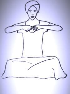 Сядьте со скрещенными ногами и прямой спиной. Поднимите руки до уровня Сердечного Центра, так чтобы локти были параллельны полу и направлены в стороны. Переплетите указательные пальцы, поддерживая несильное растяжение, большие пальцы оставьте лежать на средних.