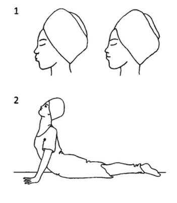 2. В позе Кобры, запрокинув голову назад, смотря вверх, зафиксируйте взгляд на точке на потолке. Делайте вдох через нос, выдох со свистом через рот в течение 3-5 минут. Расслабьтесь в течение 2 минут.