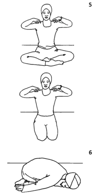 5. Скручивание позвоночника. Сядьте в Простую Позу, положив кисти рук на плечи, большие пальцы смотрят назад. Поворачивайте корпус следующим образом: вдох — влево,