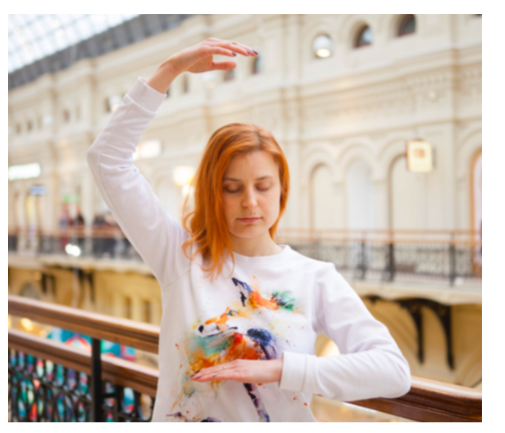• Поместите вашу левую руку на уровне вашего сердечного центра, ладонь смотрит вниз, а большой палец касается груди.