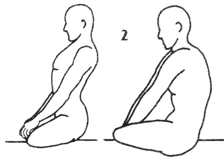 Перейдите на колени-пятки. Положите руки ладонями вниз на бедра, как можно ближе к коленям. Со вдохом прогибайте спину вперед, а с выдохом – назад. Глаза по-прежнему закрыты и сведены в точку Межбровья.