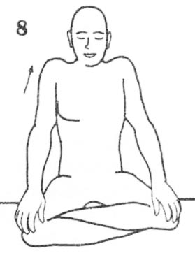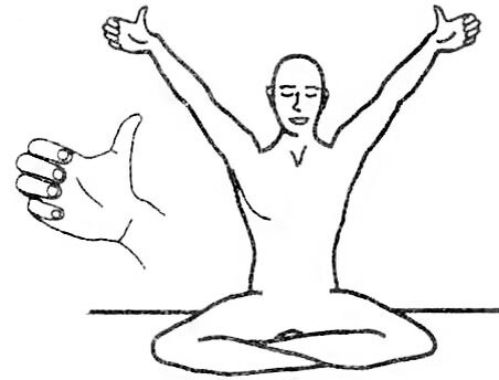 3. Искоренение Эго. Сядьте в Простую позу со скрещенными ногами и прямой спиной. Удерживайте легкий Горловой замок. Глаза закрыты и сведены в точку Межбровья. Руки выпрямлены в локтях и подняты вверх под 600. Чуть отведите руки назад, чтобы раскрыть грудную клетку. Все пальцы согнуты и касаются подушечками бугорков под ними, кроме больших. Большие пальцы выпрямлены и смотрят вертикально вверх. Плечи расслаблены, не задираются вверх, мышцы лица не напряжены. И снова – мощное Дыхание Огня.