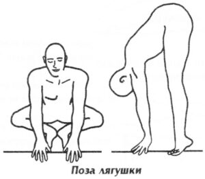 14. Крийя Лягушки Сядьте на корточки. Затем соедините пятки вместе, носки – врозь. Встаньте на носочки. Руки поместите перед собой, опирайтесь на растопыренные пальцы. Лицо смотрит вперед. Со вдохом поднимайте таз вверх, выпрямляя колени и не отрывая руки от пола, голова при этом идет вниз. С выдохом – исходное положение – таз опускается, голова взлетает в верхнюю точку. Быстрое движение, мощное дыхание.