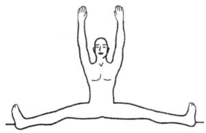 4. Растяжение жизненного нерва. Сядьте на пол, разведите прямые ноги как можно шире в стороны, оттяните руками ягодицы назад. С выдохом наклонитесь влево и захватите руками большой палец ноги. Со вдохом поднимитесь в исходное положение, вытягивая прямые руки вверх. Со следующим выдохом наклонитесь к правой ноге. Выполняйте поочередные наклоны к ногам. Удерживайте Джаландхара бандху, шея – как продолжение прямого позвоночника. Стремитесь сводить лопатки. Глаза закрыты и сведены в точку Межбровья. Наклоны происходят от копчика, не надо тянуться к коленям головой, все время сохраняйте прямую спину. Носочки тяните на себя. Колени не отрываются от пола.