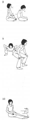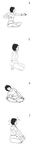 7. Сядьте в Простую Позу с прямой спиной, руки лежат на коленях. Наклоняйте голову вперёд, назад, влево, вправо, возвращаясь в центральное положение после каждого наклона. Произносите про себя «Са» во время наклона головы вперёд, «Та» — назад, «На» — налево и «Ма» — направо. Выполняйте движения ритмично, координируя их с мантрой, в течение 2-3 минут.