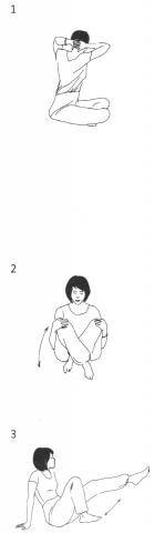 3. Выпрямите обе ноги перед собой. Держа руки прямыми, обопритесь сзади на них, пальцы смотрят назад. Согните ноги в коленях и начните быстро и мощно как бы наносить удары ногами в воздухе. Лодыжки и ступни остаются расслабленными, концентрация на движении в области ниже колен. Продолжайте 3 минуты.
