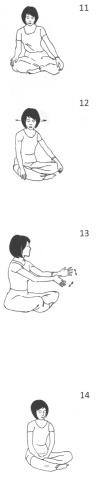 1. Сядьте в Простую Позу. Соедините руки в Замок Венеры за головой в том месте, где соединяются голова и шея. Вытяните локти в стороны таким образом, чтобы они были параллельны полу. Начните быстрые вращения слева направо, останавливаясь на один счёт в центре (движения по 1 секунде в каждом направлении). Вдох делается на каждой из сторон, выдох — в центре. Делайте полные повороты в каждую сторону. Продолжайте 9 минут. Данное упражнение убирает плечевое напряжение и расслабляет мышцы груди. Когда мышцы груди напряжены, мышцы живота также испытывают напряжение, что приводит к отложению жира в области живота. Когда мышцы плеч разработаны, то это положительно влияет и на приток крови к мозгу.
