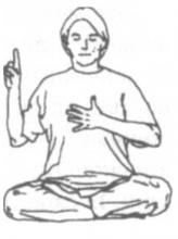 Сядьте в простую позу с прямой спиной. Расставьте пальцы левой руки, настолько широко, насколько возможно, и положите руку на сердечный центр с большим пальцем, указывающим вверх. Сожмите в кулак правую руку с Указательным пальцем направленным вверх. Поднимите правую руку так, чтобы кончик указательного пальца оказался на уровне глаз, а ладонь направлена вперед. Закройте глаза и сделайте несколько циклов глубокого дыхания. Затем начните петь :