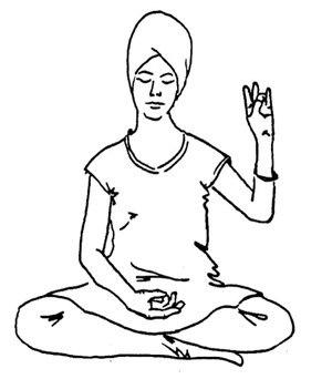 Сядьте с прямой спиной. Поместите правую руку на высоте уха кончик большого пальца и кончиком безымянного пальца соприкасаются (ногти не трогайте). Поместите левую руку на колени соединив кончик большого пальца и мизинца. Женщинам необходимо изменить положение рук, в реализации этой Мудры.