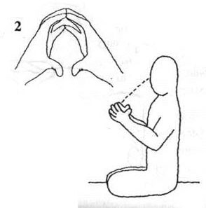 2. Оставаясь в этом же положении, соедините кончики пальцев вместе, чтобы выровнять энергию, большие пальцы при этом выпрямлены и не касаются друг друга. Кисти рук расслабленны. «Хариян» — это не нейтральная мантра, так что большие пальцы, представляющие эго, должны быть врозь. Смотрите вниз через руки под углом 60%. Произносите 16 раз «Хариян» на одном дыхании. (Каждый цикл занимает приблизительно 13-15 секунд) 11-31 минута.
