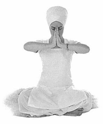 Ладони вместе, слегка соприкасаются. Кончик пальцев Сатурна (средние) находятся на уровне Третьего глаза. Предплечья горизонтальны к полу, локти не опускаются. Загляните внутрь себя.