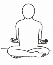 • Руки по бокам вдоль тела. Согните руки в локтях и направьте предплечья вперед параллельно полу. Ладони смотрят вверх, пальцы в Гьян мудре (кончики больших и указательных пальцев соединены).